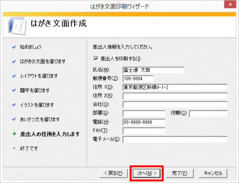 - 差出人情報の確認と入力が完了したら、「次へ」ボタンをクリックします。