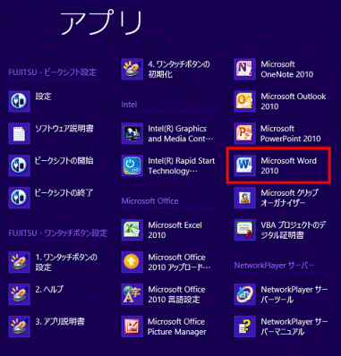 「Microsoft Word 2010」が画面内に表示されていない場合は、画面を右にスクロールしてから確認してください。