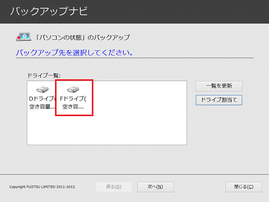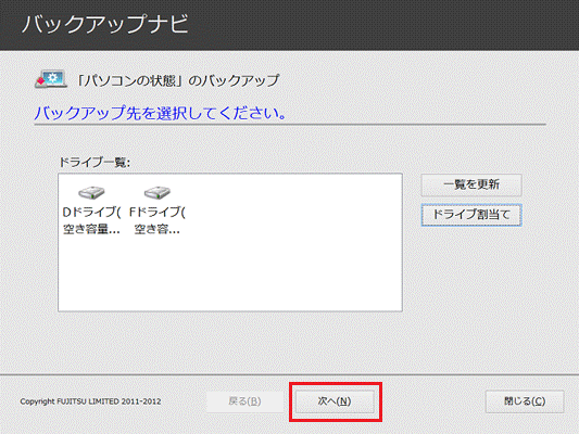11. 「バックアップ先を選択してください。」と表示された場合は、次のとおり操作します。
