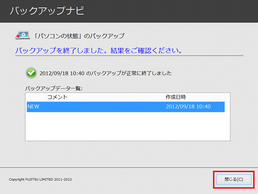 バックアップが正常に完了していることを確認して「閉じる」ボタンをクリックします。