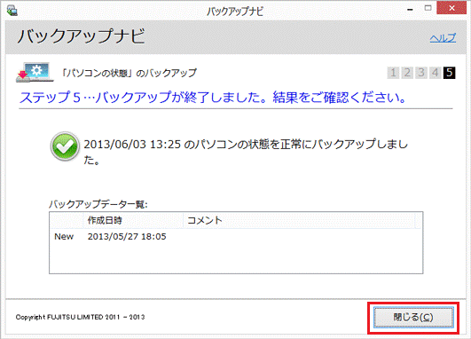 バックアップが正常に完了していることを確認し、「閉じる」ボタンをクリックします。