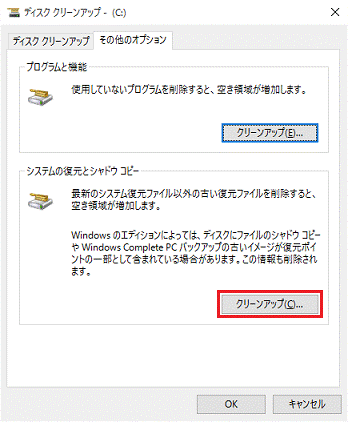 - 「システムの復元とシャドウコピー」の「クリーンアップ」ボタンをクリックします。
