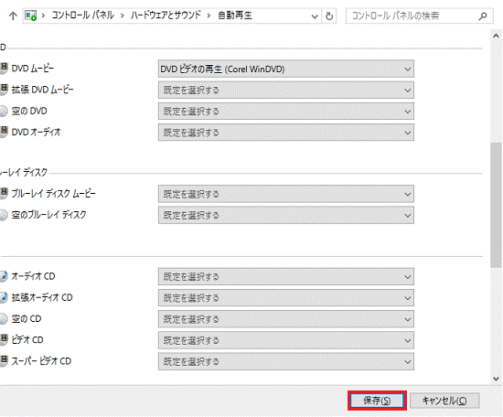 (「DVD」欄の「DVDムービー」項目で「DVDビデオの再生(Corel WinDVD)」を選択する場合) - 「ハードウェアとサウンド」(または、「すべてのコントロールパネル項目」)に戻ります。