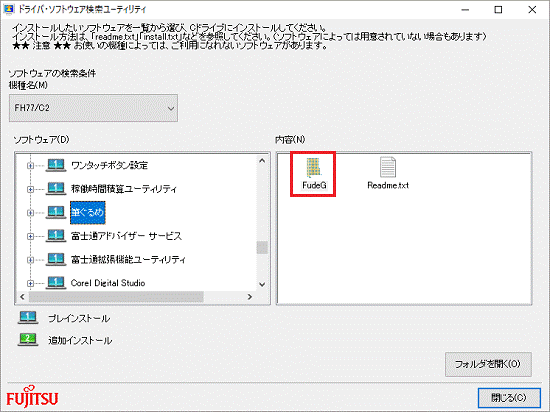 - 「内容」欄の「FudeG」フォルダーをダブルクリックします。