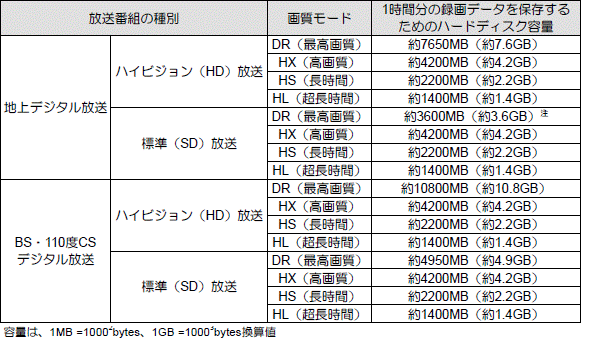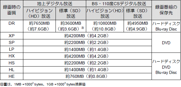 - 注1:標準(SD)放送をHXで録画したとき、DRよりデータ容量が大きくなる場合があります。