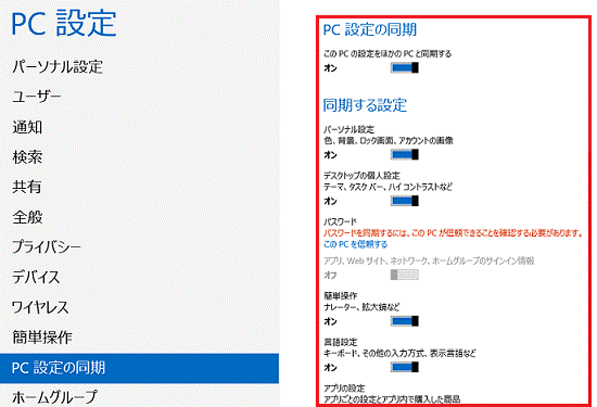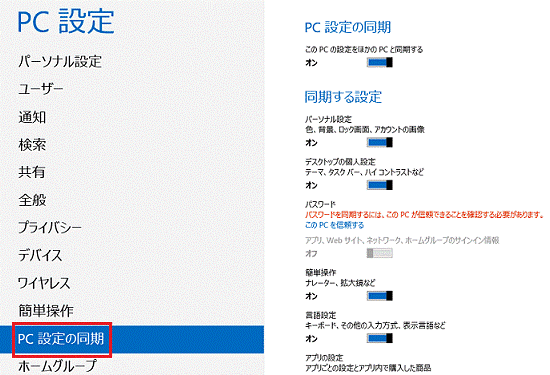 - 「PC設定の同期」から各項目をクリックして、「オン」と「オフ」を切り替えます。