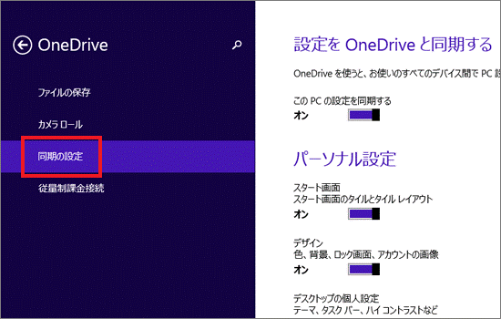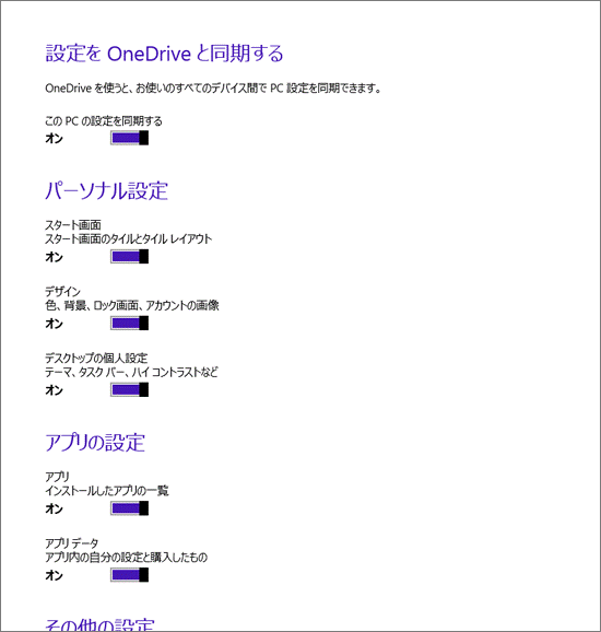 - Windows 8.1 では、同期をオフにしても、システムとアプリの設定の一部がインターネット上のOneDrive(SkyDrive)に保存されたままになります。