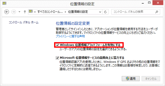 「Microsoft 位置情報サービスの品質向上に協力する」は、お好みでチェックを付けます。 - 「適用」ボタンをタップします。