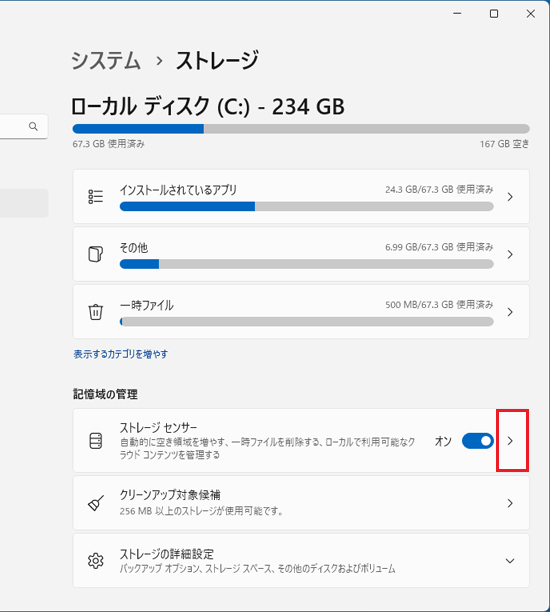 Windows 11のストレージセンサーは、一時ファイルやごみ箱の中身など、不要なファイルを削除して、空き容量を増やす機能です。