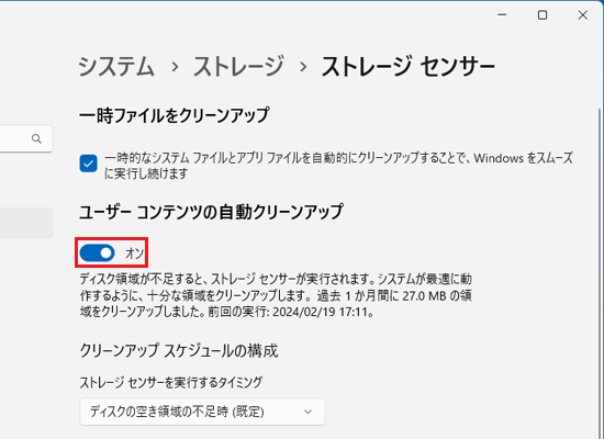 (ユーザーコンテンツの自動クリーンアップのスイッチが「オン」(青色)の場合) - ストレージセンサーを実行する場合