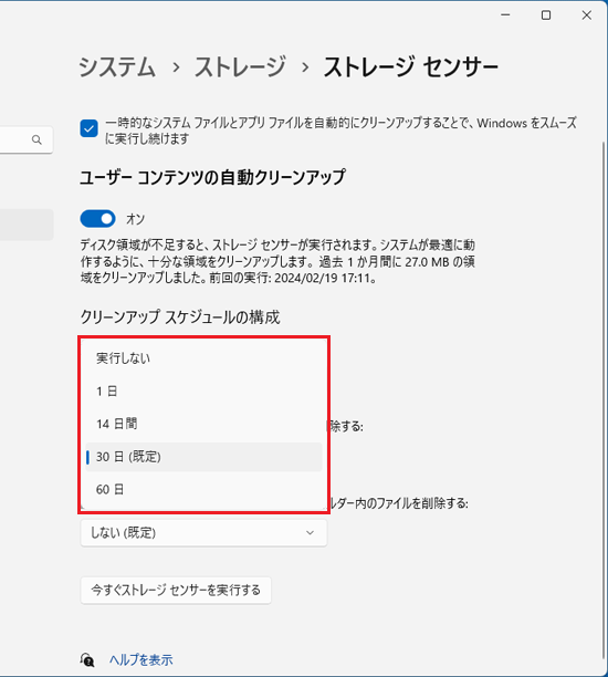 - 「ストレージセンサーを実行するタイミング」から、実行する頻度を選択します。