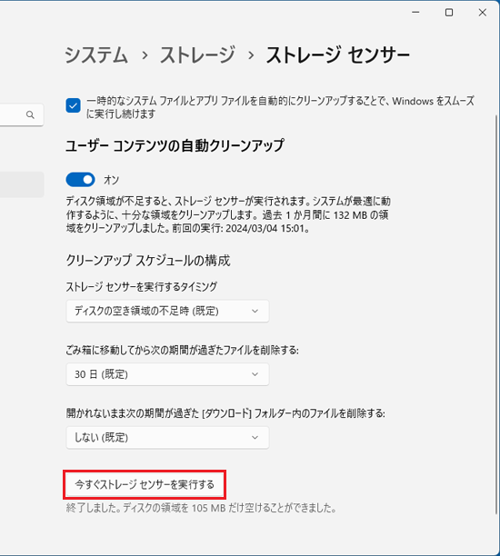 - 設定した内容で今すぐストレージセンサーを実行したい場合は、「今すぐストレージセンサーを実行する」ボタンをクリックします。
