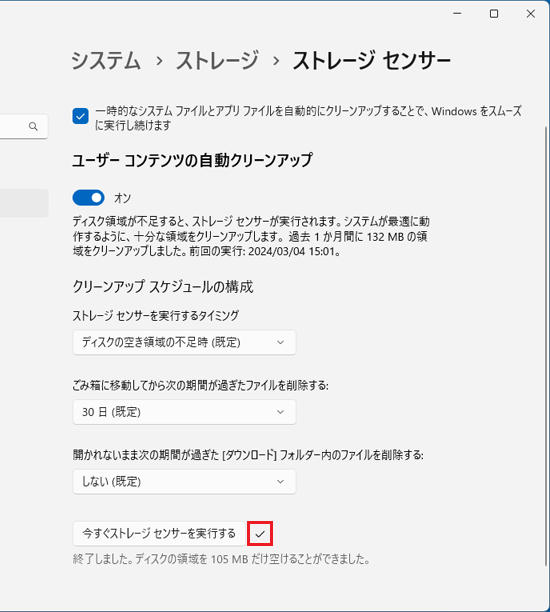 アドバイス「今すぐストレージセンサーを実行する」をクリックし、完了すると「今すぐストレージセンサーを実行する」ボタンの隣に「チェックマーク」が表示されます。