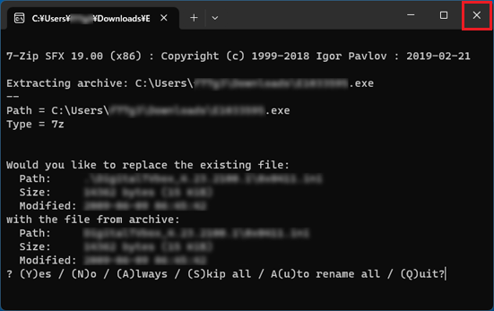 - 「7-Zip」、「Would you like to replace the existing file」画面が表示された場合は、閉じるボタンで画面を終了し、次の手順に進みます。