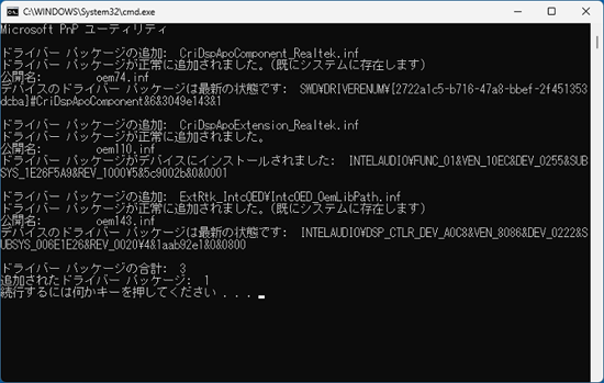 完了まで、しばらく待ちます。 - インストールが完了すると、「続行するには何かキーを押してください...」と表示されます。