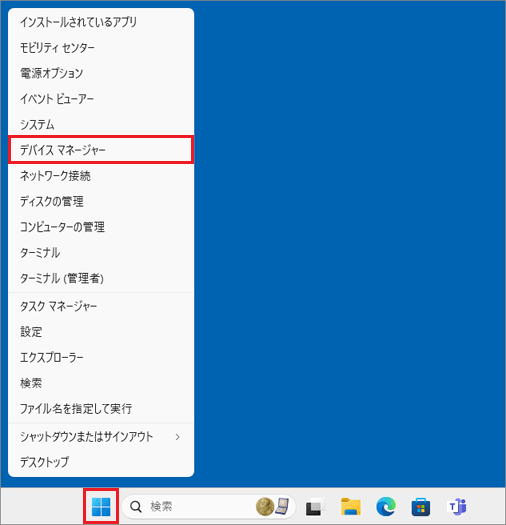 - 「スタート」ボタンを右クリックし、表示されるメニューから「デバイスマネージャー」をクリックします。