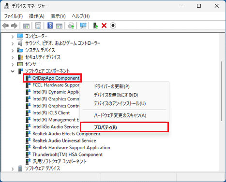 - 「CriDspApo Component」を右クリックし、表示されるメニューから「プロパティ」をクリックします。