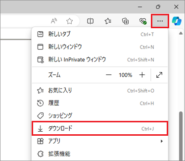 - ここまでの手順で「ダウンロード」フォルダーを閉じてしまった場合は、Microsoft Edgeを起動し、右上の「…」(設定など)→「ダウンロード」の順にクリックして表示される、「ダウンロード フォルダーを開く」ボタンをクリックします。