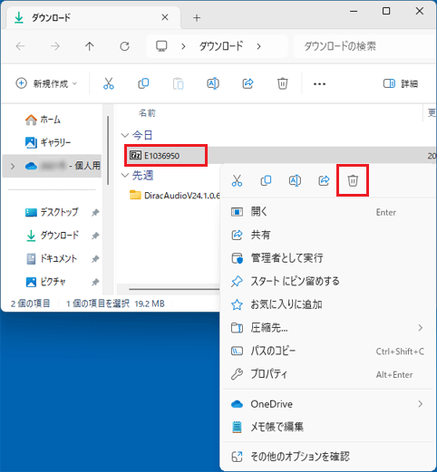 - ダウンロードして保存した「E1036950」(または「E1036950.exe」)アイコンを右クリックし、表示されるメニューから「削除」をクリックします。
