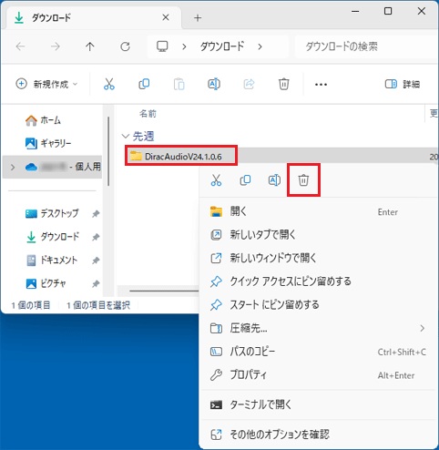- 「DiracAudioV24.1.0.6」フォルダーを右クリックし、表示されるメニューから「削除」をクリックします。