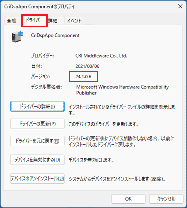 「ドライバー」タブをクリックし、バージョンを確認します。