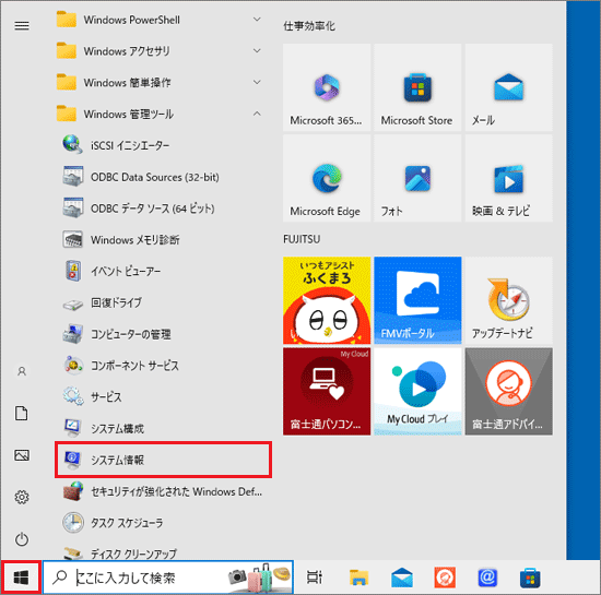 - 「スタート」ボタンをクリックし、すべてのアプリの一覧から、「Windows 管理ツール」→「システム情報」の順にクリックします。