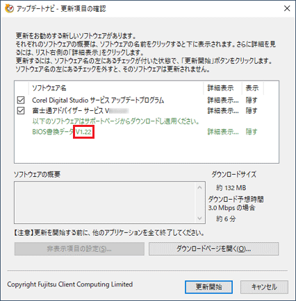 - アップデートナビに表示された「BIOS 書換データ」のバージョンを確認します。