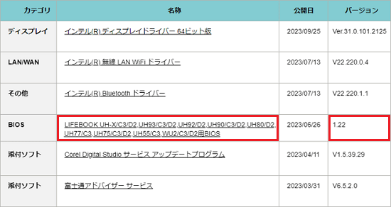 BIOS書換データが提供されている場合は、BIOS書換データのバージョンと見比べる必要があります。