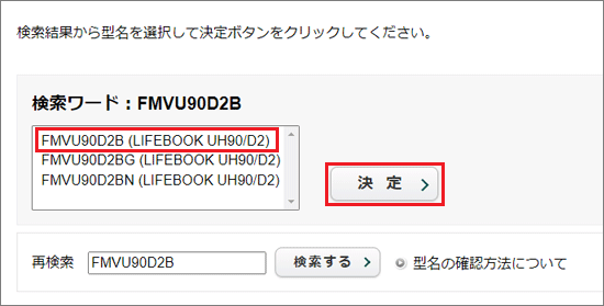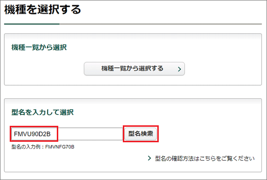 (「FMVU90D2B」を検索する場合の例) - 「製品型名から検索する」と表示されます。