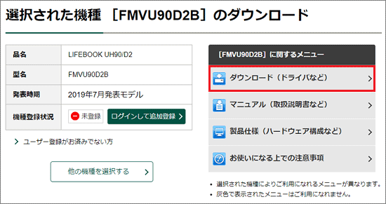 (「UH90/D2」を使用している場合の例) - 「選択された機種[機種名]のダウンロード」と表示され、BIOSをアップデートする機種が表示されていない場合