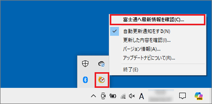 - 「アップデートナビ」アイコンを右クリックして表示される「富士通へ最新情報を確認」の順にクリックします。