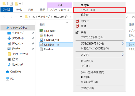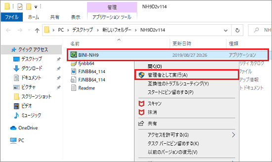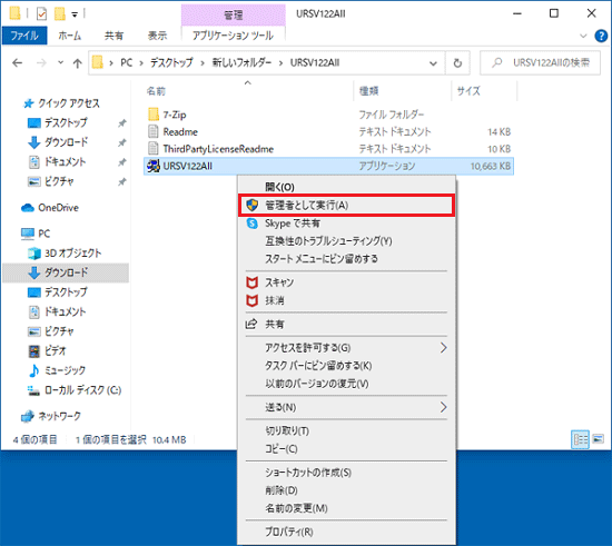 種類が「アプリケーション」のファイルを右クリックし、「管理者として実行」をクリックします。