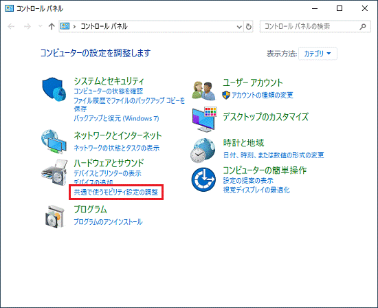 - 「コントロールパネル」の「共通で使うモビリティ設定の調整」または、「Windows モビリティセンター」をクリックします。