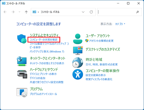 - 「コントロールパネル」が表示されたら、「システムとセキュリティ」の「コンピューターの状態を確認」をクリックします。