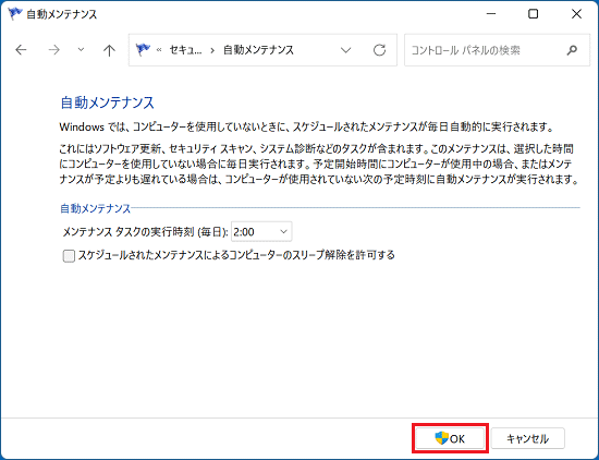 - 「スケジュールされたメンテナンスによるコンピューターのスリープ解除を許可する」のチェックボックスに、チェックが付いているかどうかを確認します。