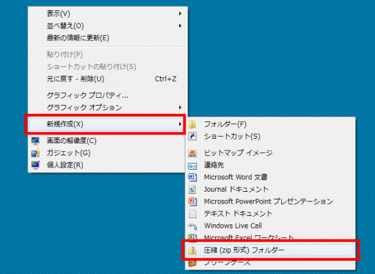 - デスクトップの何もないところを右クリックし、表示されるメニューから「新規作成」→「圧縮(zip)フォルダー」の順にクリックします。