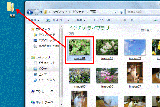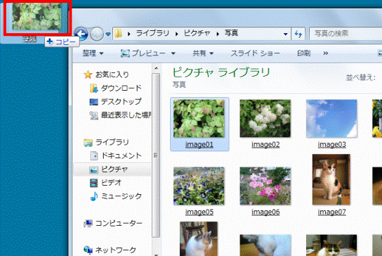- 圧縮されたフォルダー内のファイルをドラッグし、マウスポインターを、展開先まで動かします。