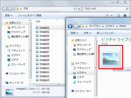 - ファイルをドラッグし、マウスポインターを、圧縮されたフォルダーまで動かします。