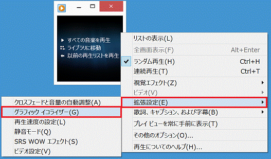 Windows Media Player の何もないところを右クリックし、表示されるメニューから、「拡張設定」→「グラフィック イコライザー」の順にクリックします。