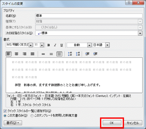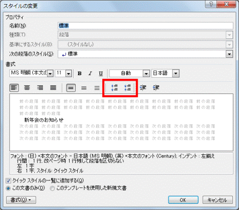 文書全体の間隔を設定する場合は、次の手順でスタイルを変更します。