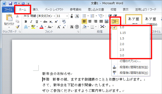 - 「ホーム」タブの上下の矢印と4本線が描かれた「行と段落の間隔」ボタンをクリックし、表示されるメニューから、目的に応じた行数(1.15〜3.0)をクリックします。