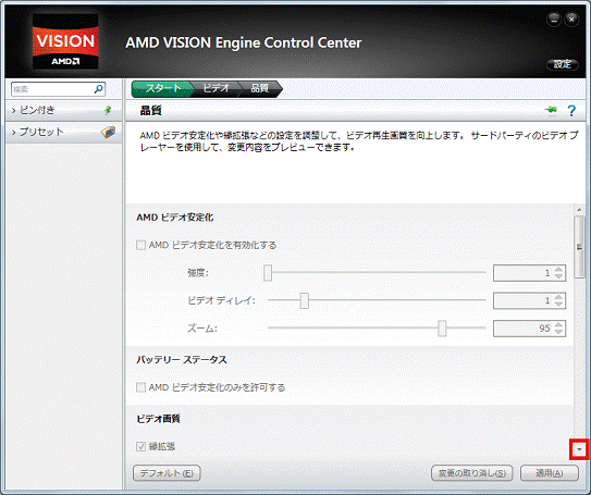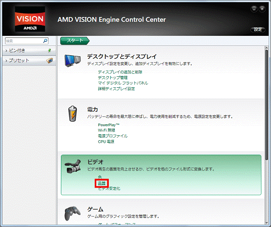 - 「スタート」ボタン→「すべてのプログラム」→「AMD VISION Engine Control Center」→「AMD VISION Engine Control Center」の順にクリックします。