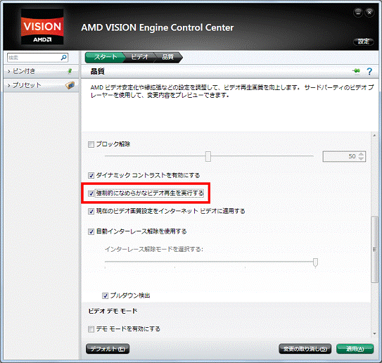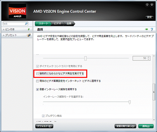 チェックがある場合は、「強制的になめらかなビデオ再生を実行する」をクリックし、チェックを外します。
