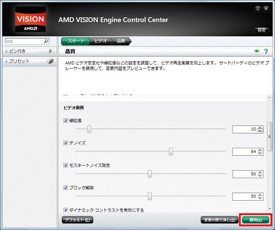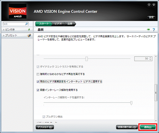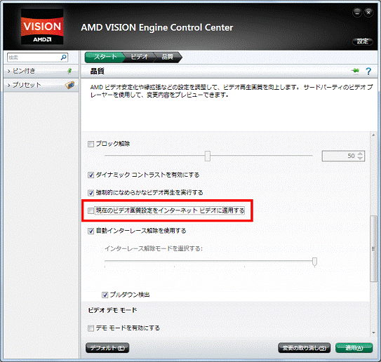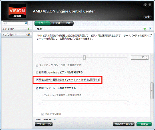 インターネット上の動画をくっきり機能で再生したい場合は、上の設定に加え、「現在のビデオ画質設定をインターネットビデオに適用する」をクリックし、チェックを付けます。
