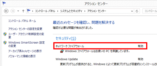 現在、有効になっているファイアウォールは、アクションセンターで確認できます。