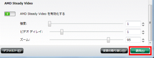 - 「AMD Steady Video」の「AMD Steady Videoを有効化する」のスイッチをクリックし、「○」に設定します。