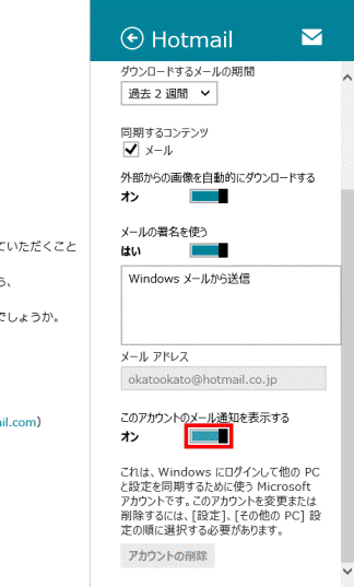 - 「このアカウントのメール通知を表示する」をクリックまたはタップして「オン」にします。