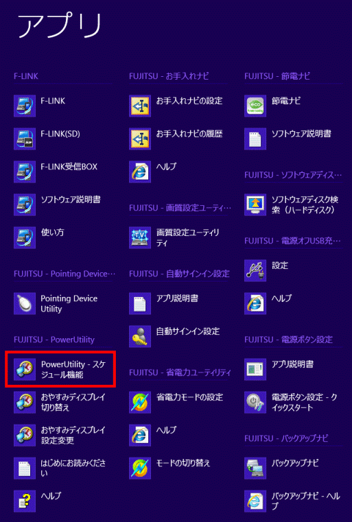 「FUJITSU - PowerUtility」の項目にある「PowerUtility - スケジュール機能」をクリックします。