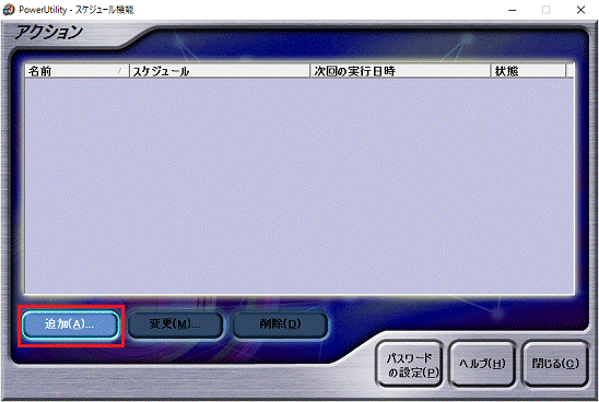 - 「PowerUtility - スケジュール機能」(または「PowerUtility-スケジュール」)の「追加」ボタンをクリックします。