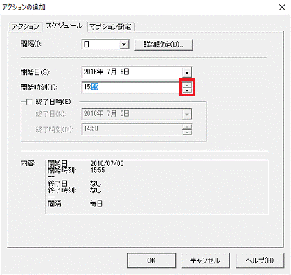 - 「開始時刻」欄の「▲」ボタンや「▼」をクリックし、開始時刻の分を設定します。